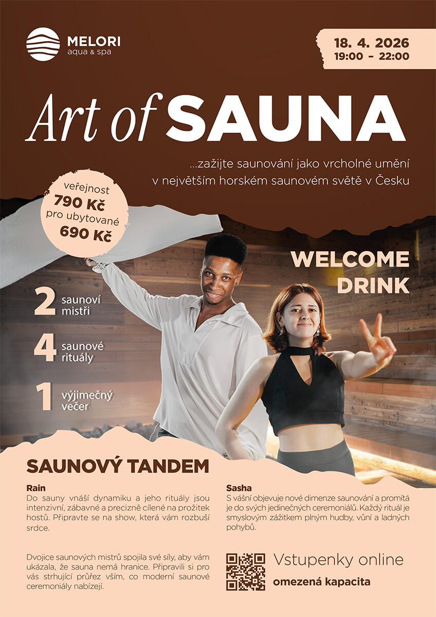 18.4.2026 - Art of Sauna / 19:00 - 22:002 špičkoví saunéři, 3 hodiny intenzivních zážitků, 1 nezapomenutelná noc. Vstup pro návštěvníky od 18:30. V ceně vstup do celého saunového světa.