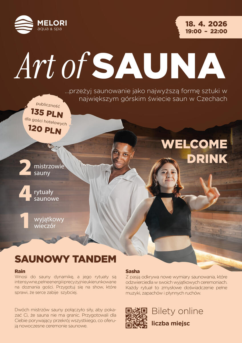 To wyjątkowe wydarzenie odbywa się regularnie raz w miesiącu i zawsze oferuje oryginalny program. Art of Sauna opiera się na występach 2–3 czołowych saunmasterów z Czech i zagranicy, którzy należą do najlepszych w swoim fachu. Każdy z nich wnosi własny styl, energię i osobiste podejście.