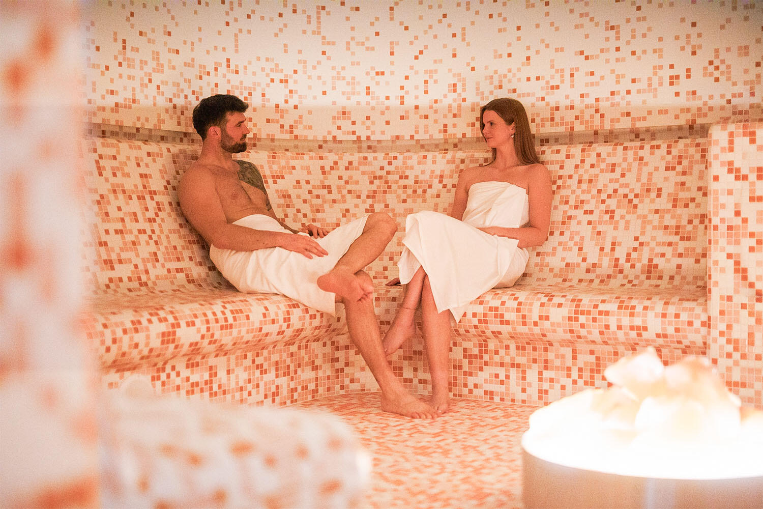 Přesně tak se cítíte v solné parní kabině – páře, která prochází přes prosvětlené přírodní solné kameny a vytváří mikroklima blahodárné pro dýchací cesty, pokožku i psychiku. Odcházíte lehčí, uvolněnější a s jasnější myslí. Je ideální v kombinaci se solným peelingem.